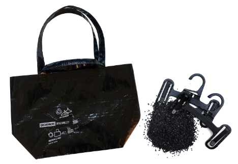 在賣場銷售衣物所附的廢棄衣架,經回收再生後製成扁紗,並再製成可重複使用的環保購物袋,供店內消費者購物時使用。